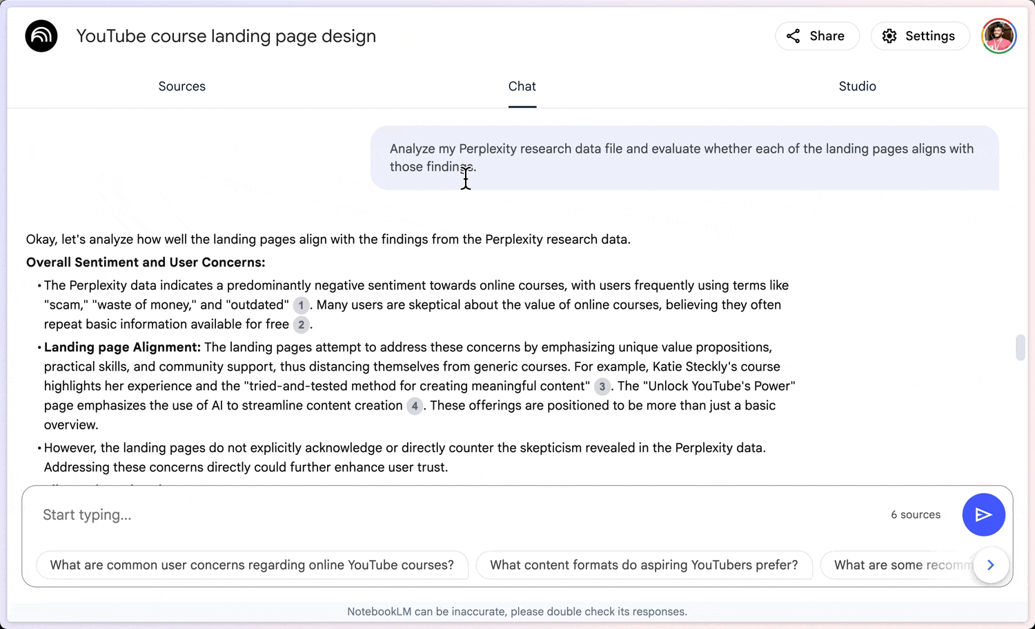 NotebookLM doesn’t stop there. You can upload your audience research from Perplexity and ask it to cross-reference findings using the below prompt.