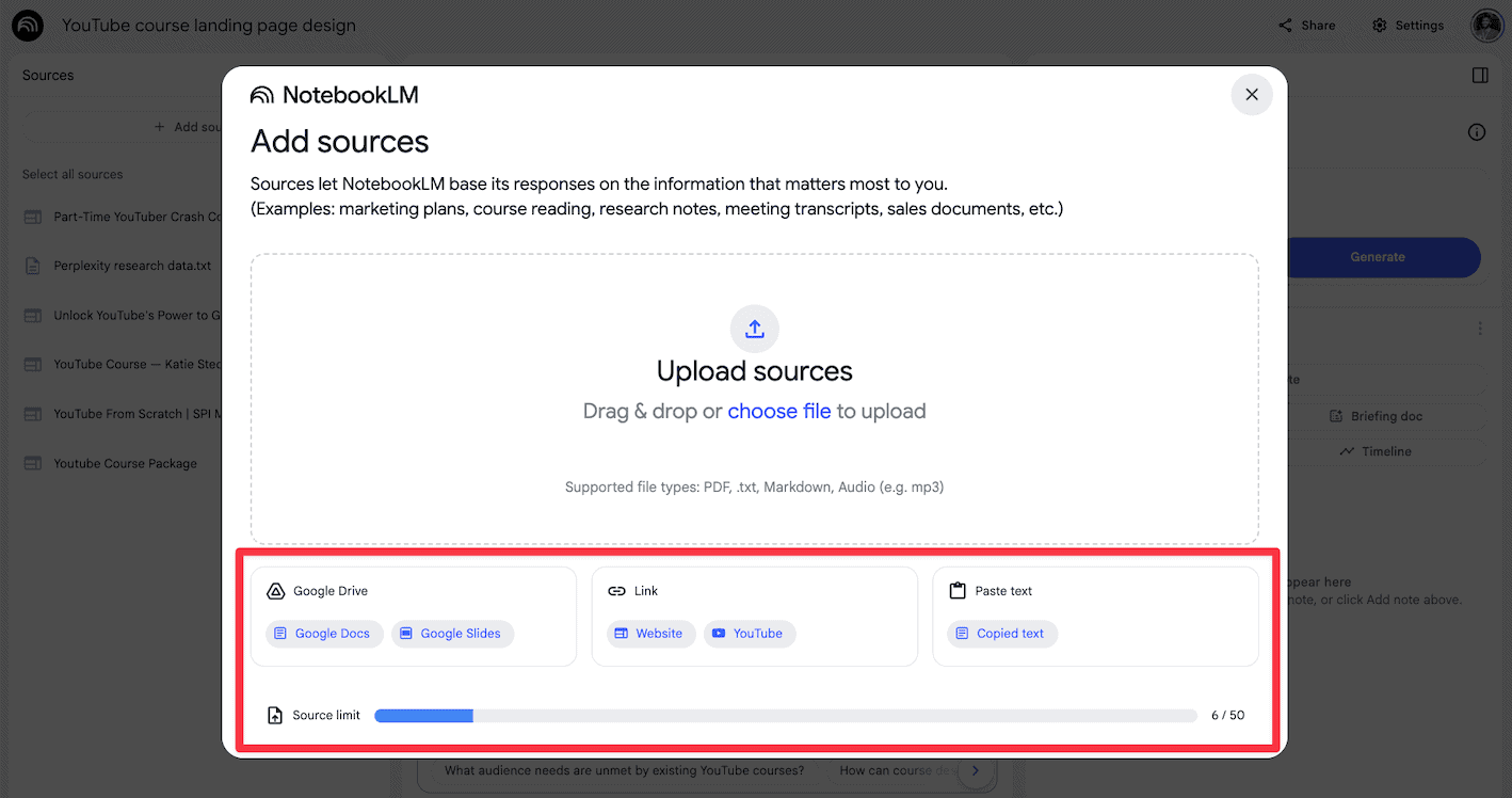 In this case, you’ll upload a list of competitor landing page URLs into NotebookLM.