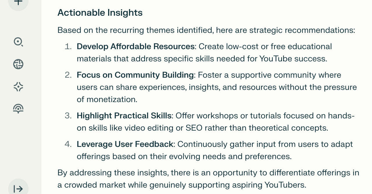 - Actionable Insights: Provide strategic recommendations based on recurring themes, unmet needs, and potential areas for differentiation.