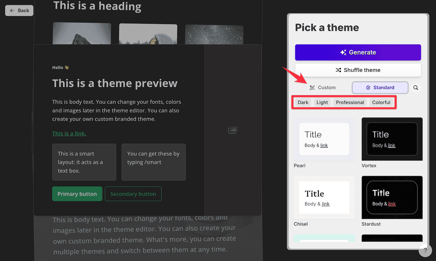 Choose from various themes (light, dark, professional, or colorful) to match your brand identity, or you can also use your custom theme.