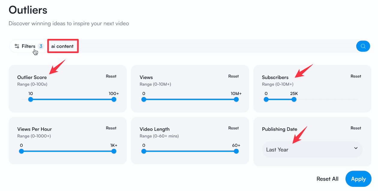 3. YouTube Videos: Use tools like VidIQ’s outlier feature to find successful videos from smaller channels.
