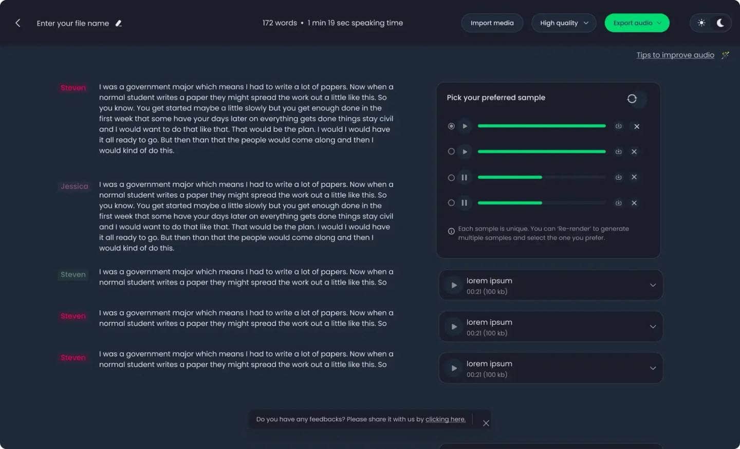 It lets you add intonation to match your voice patterns and offers audio editing options like removing filler words, retakes, adjusting tone, and seamlessly splicing audio.